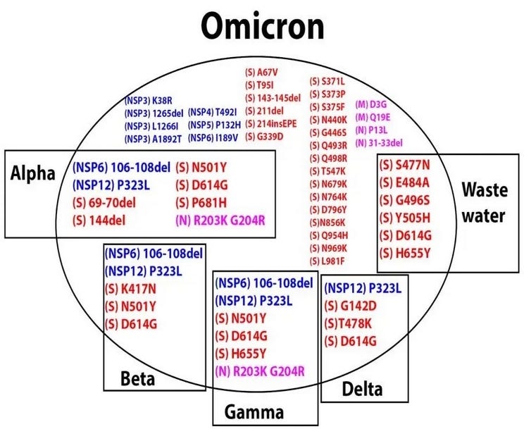- Unusually high mutation burden concentrated in spike RBD and NTD — Omicron carries far more spike changes than prior VOCs; the density of substitutions in the RBD (including multiple receptor‑binding residues) is highly atypical and suggests accelerated evolution rather than gradual accumulation.